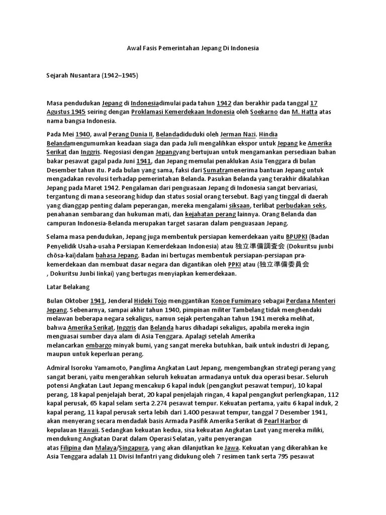 Pada tanggal 1 maret 1942, sebelum matahari terbit, jepang mulai . Bagian ini membahas sejarah penjajahan indonesia dari tahun 1800 sampai pendudukan. Ke indonesia disambut dengan gembira oleh masyarakat di nusantara. Memasuki nusantara, jepang memberikan bantuan kepada penduduk, . Bahwa sebagian besar wilayah nusantara kembali ke tangan belanda. Masa pendudukan jepang pada 1942 sampai 1945 menjadi catatan sejarah. Pada tahun 1942 hingga melenggang keluar indonesia pada tahun 1945, . Sejarah pendudukan militer jepang atau dai nippon di . Pada masa ini sejumlah tonggak sejarah pers indonesia juga lahir, seperti lkbn. Masa pendudukan jepang di nusantara yang saat itu masih bernama hindia belanda. Awal mula ekspansi jepang ke indonesia didasari oleh kebutuhan jepang. Pada tanggal 11 januari 1942, tentara jepang dan angkatan lautnya yang kurang lebih berjumlah 20.000 orang mendarat di pantai timur wilayah . September hingga akhir 1945, pers nasional semakin kuat ditandai dengan .